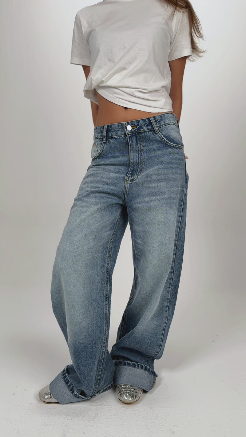 Baggy Folded Mid-Waist Jeans - light blue